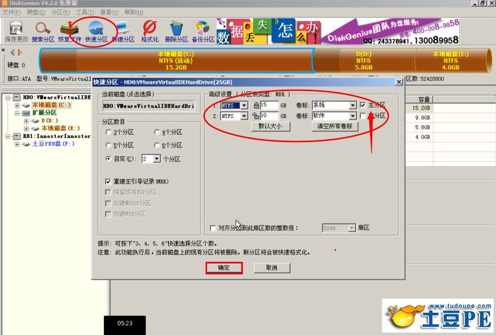 只要照着以上步骤,一个全新的硬盘就已经分好区了,分完以后,要马上重装系统,不然是开不了机的!今天就介绍到这里,感谢大家对土豆PE的支持!