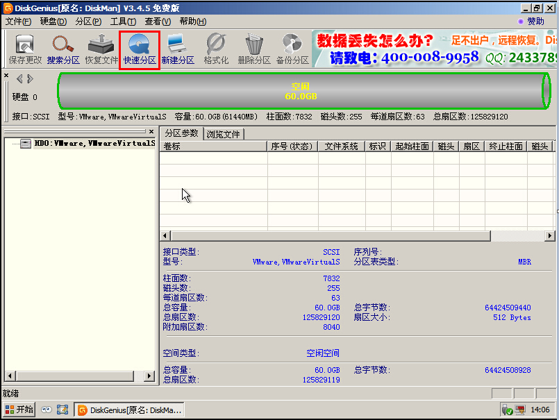 打开后如图:这是一个没有分区有硬盘,接下我们对硬盘进行分区,点击快速分区