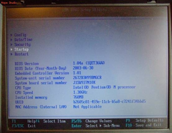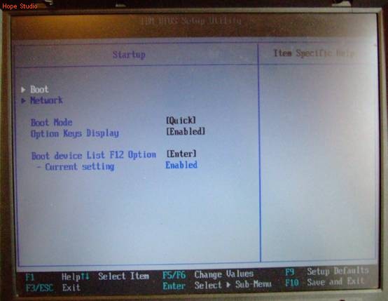 2、Thinkpad x310开机出现Thinkpad开机画面后按F12进入启动选项界面,在弹出的窗口中选择U盘就可以从U盘启动(会进入下一步),按F12如果没有出现U盘启动选项,就改下BIOS设置:开机出现第一个界面时按F1进入BIOS,找到startup选项卡中进入,如下图: