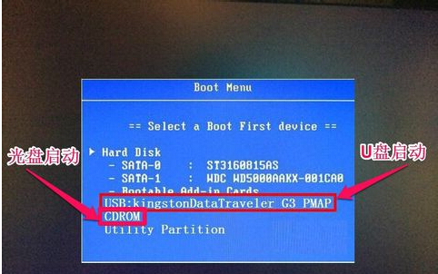 2、在弹出的界面中,可以看到USB驱动u盘启动的选项了,用方向键将光标移至u盘启动项,按回车键即可进入U盘,从U盘启动。