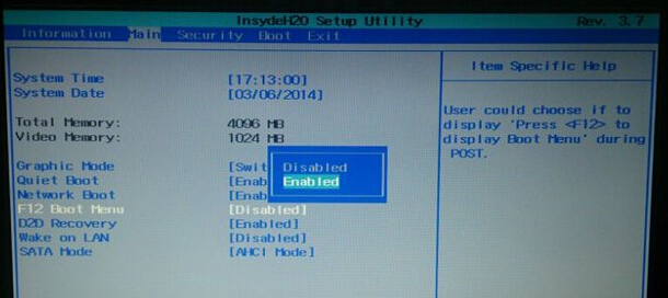 1、开机按“F2”键,进入bios,选择Main选项中的“F12 Boot Menu”更改为“Enabled”;