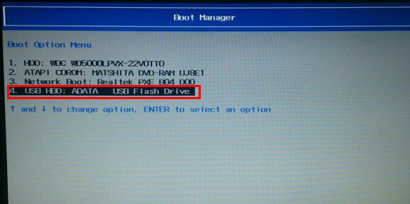 2、保存并自动退出重启电脑,按下F12键进入u盘启动!如下图所示:选择要启动的设备USB HDD,就会从U盘启动