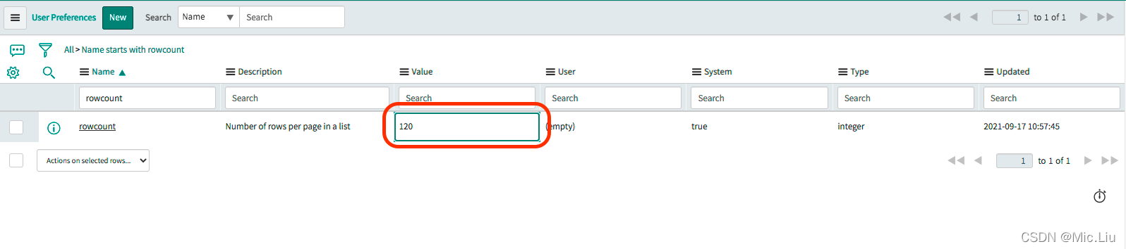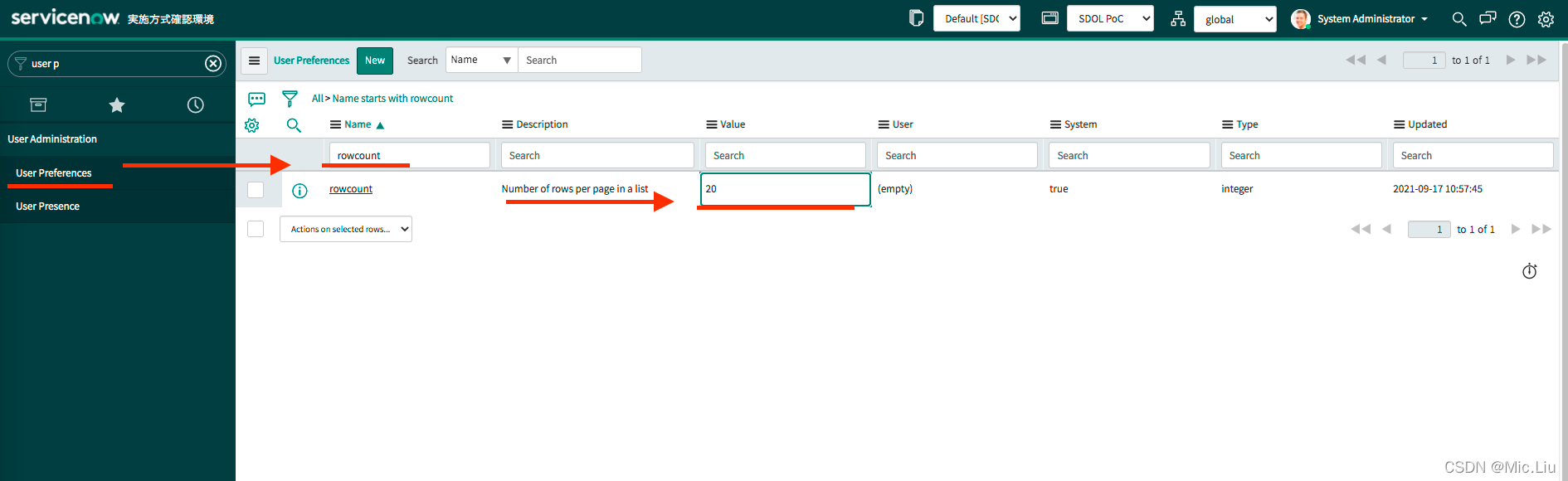 像上图中,NowPlatform虽然没有在菜单中为我们提供可以调整的选项,但是允许我们根据自己的需求进行更改。在 Filter navigator 中检索 User Preferences ,在 Name 的检索区域输入 rowcount ,默认情况下Value是20,根据自己的需求更改为自己想要的值。