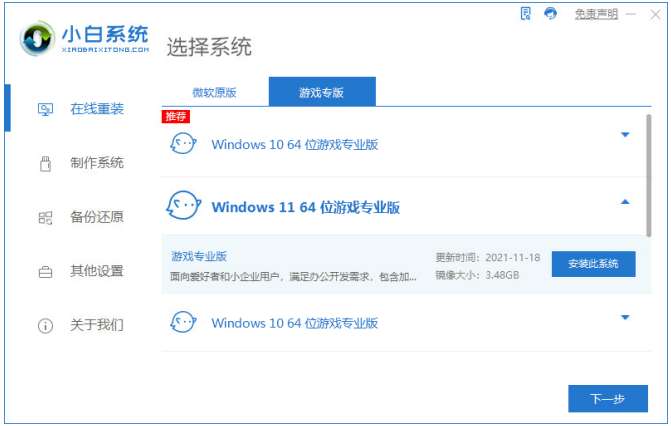 1.首先我们打开【小白一键重装系统】工具,通过小白pe系统安装win10游戏版,进入页面后找到win10游戏专业版进行下载。