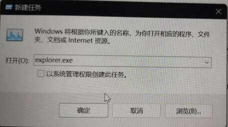 4、接着我们输入“explorer.exe”再勾选下方“以系统管理权限创建此任务”,回车确定即可修复。