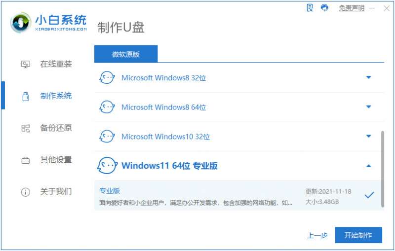 1、电脑下载安装好小白一键重装系统软件,插入空白u盘,关闭电脑上的安全杀毒软件等。打开后选择制作系统,点击开始制作启动盘。