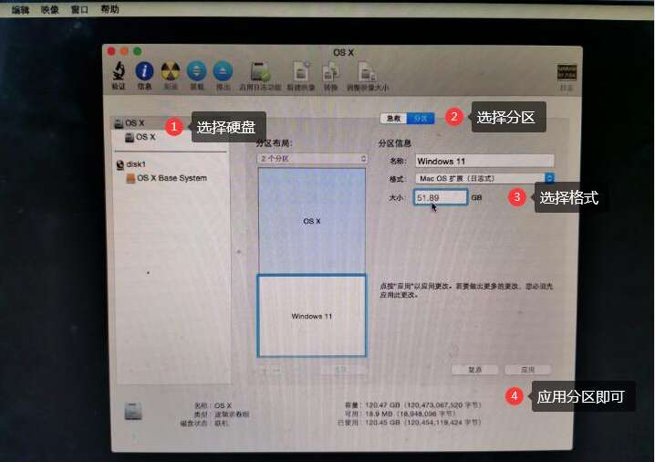 1、由于MacOS系统版本不同,只需要在苹果系统中找到磁盘工具,然后在电脑硬盘增加一个新的windows安装分区。
