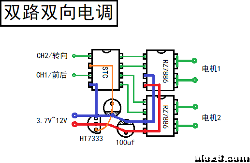 5、使用大电流集成驱动芯片:RZ7886,电路简单,告别手残党冒烟炸管。