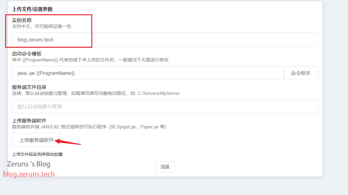 自己输入一个想设置的名称,然后点下面的上传服务端软件选择上面下载的jar文件。
