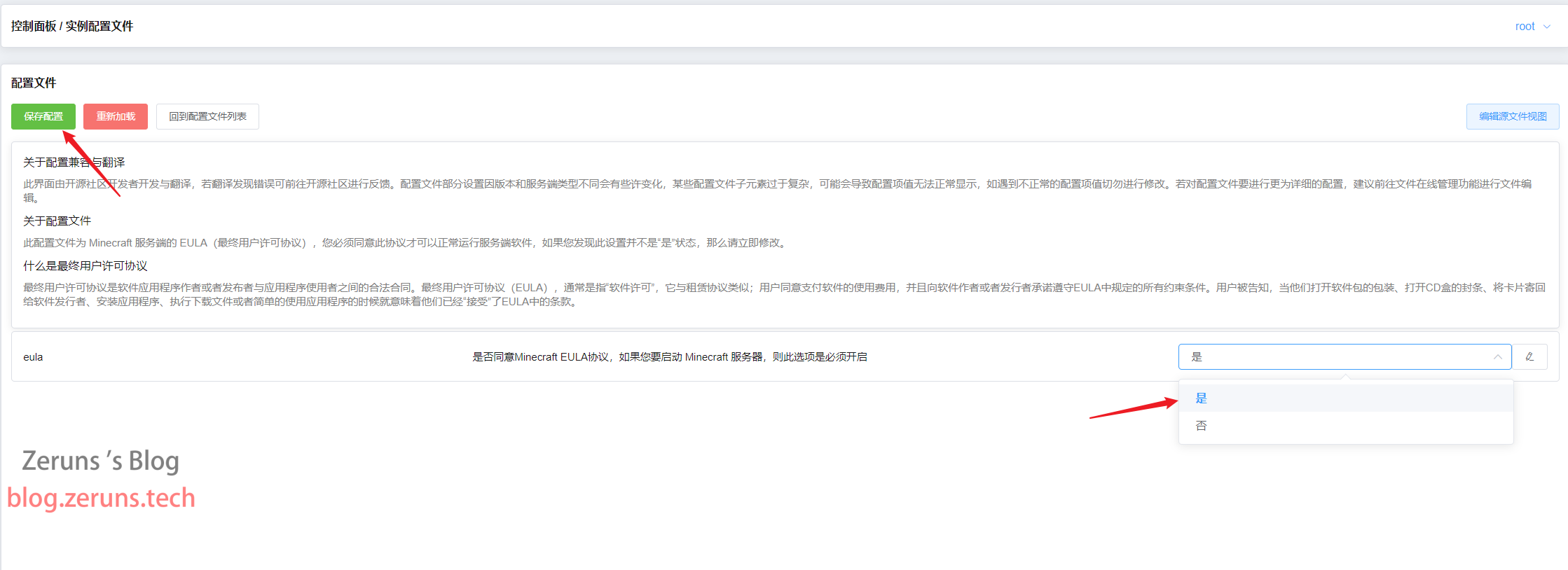 将eula的否改成是,然后点击保存配置,接着点击回到配置文件列表。
