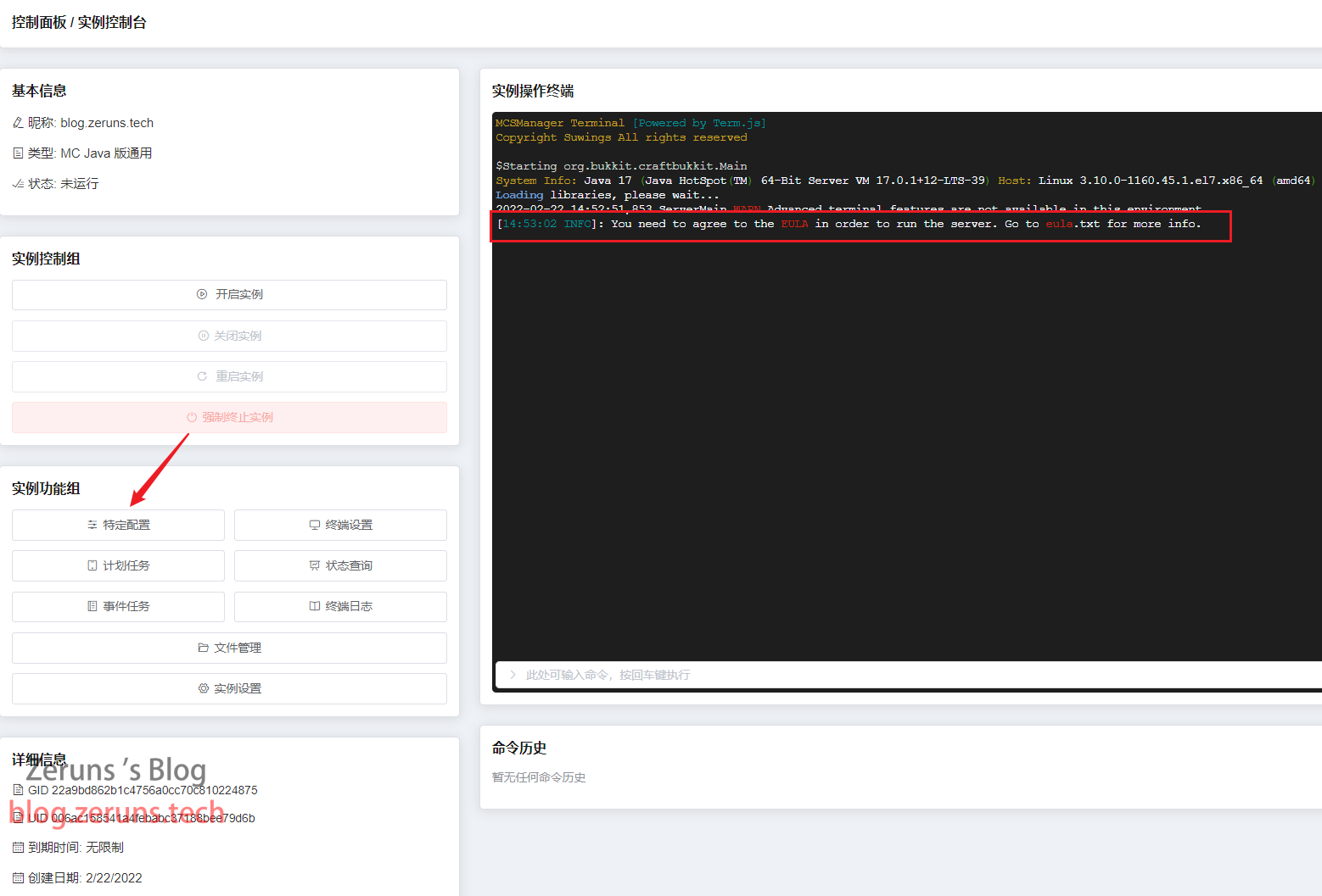 出现下图所示信息后点击特定配置,然后点击[Bukkit] eula.txt下的浏览