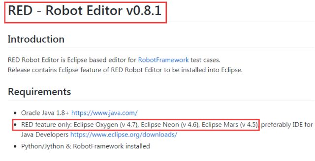 官方发布的每一个RED插件,都会有相应支持的Eclipe版本说明。(ps:jdk的安装跳过,网上百度就好)