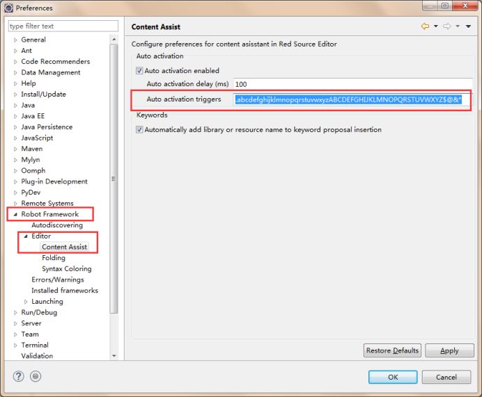 eclispe面板:windows - preference - RobotFramework - Editor - Content Assitant