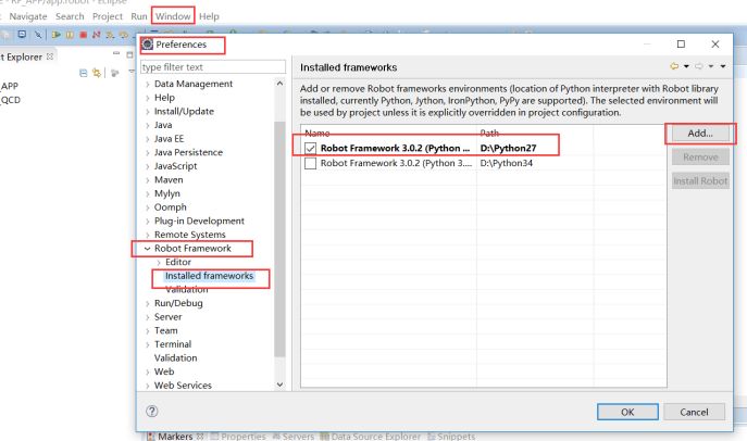 eclispe面板:windows - preference - RobotFramework - Installed frameworks