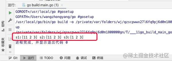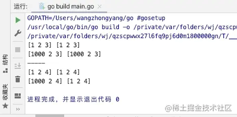 分析:通过上面的打印结果我们可以很直观的看出来,切片引用类型的本质,当切片修改时会互相影响;而数组作为值类型,不会互相影响。