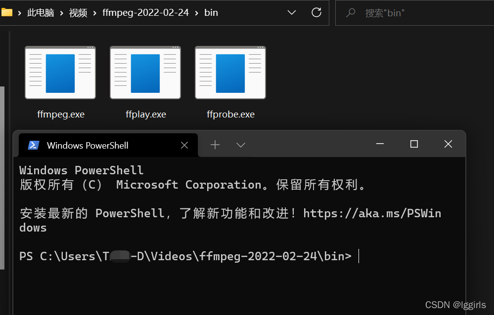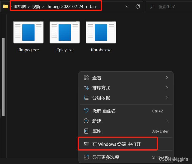 在ffmpeg.exe所在文件夹下,右击鼠标,选择 “在Windows 终端 中打开”,复制下图中所显示的地址: