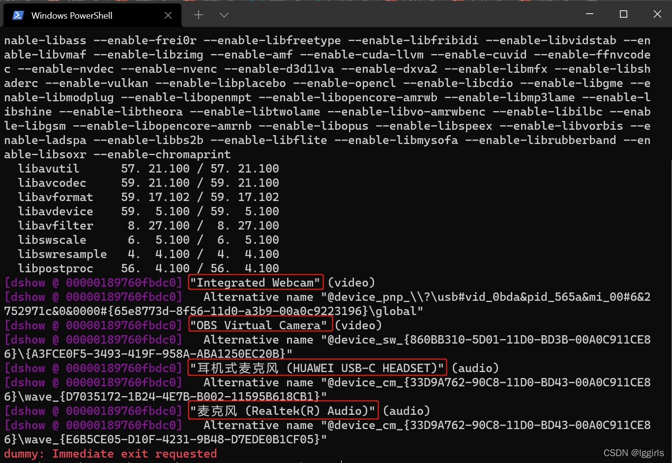 2. 查找一下推流要用到的设备列表,主要是电脑上的摄像头、声卡。