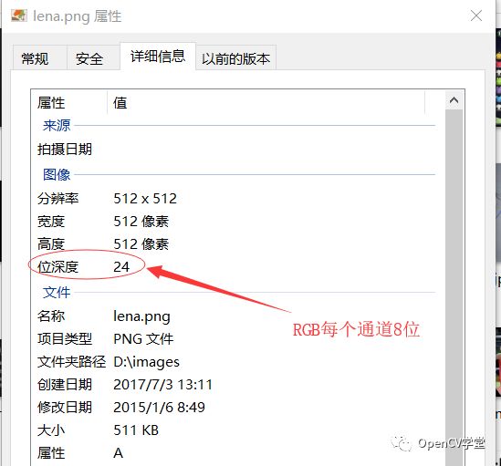 这样保存的图像默认是每个通道8位的字节图像,常见的RGB图像是图像深度为24,这个可以通过windows下查看图像属性获得,截图如下: