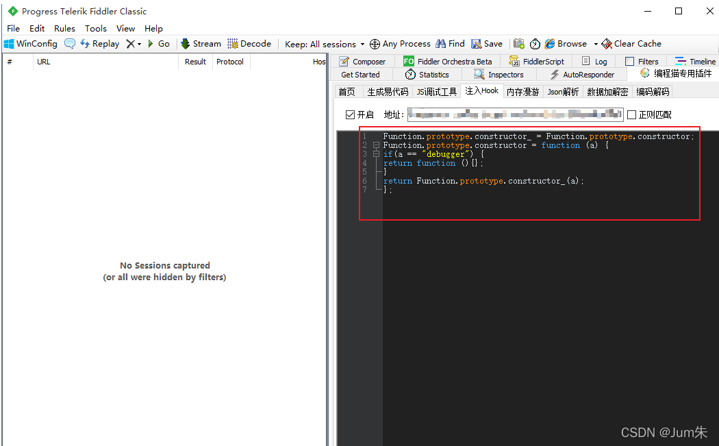 我们打开fiddler,开启hook代码如下: