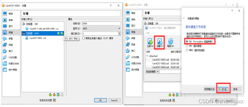 关闭虚拟机的装填下选中虚拟机->Virtualbox 菜单栏-> 设置-> 存储-> SATA控制器 -> 右击,选择“添加虚拟硬盘”,选择创建--》选择VDI类型,下一步。