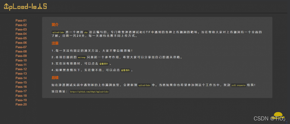 upload-labs是一个使用php语言编写的,专门收集渗透测试和CTF中遇到的各种上传漏洞的靶场。旨在帮助大家对上传漏洞有一个全面的了解。目前一共20关,每一关都包含着不同上传方式。