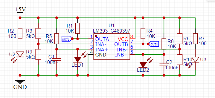 光栅比较器部分:这部分是这个电路的核心,这个图是这么看的,u2是一个一上电就持续发亮的红外线发射管,它发出的光就是光栅,上面的r2电阻是用来限流的。