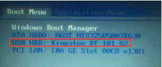 4.将U盘插进需要维修的计算机,按下电源键,快速敲击启动热键,弹出boot选择界面,选择USB选项并返回。