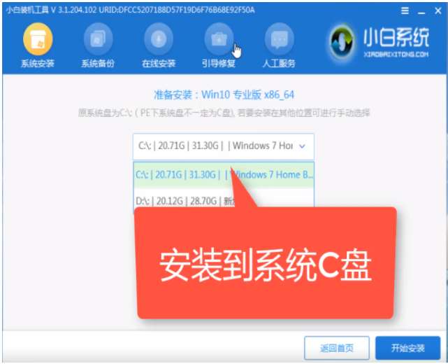 7.选择C盘,点一下开始安装。直到win10系统安装完毕,拔掉你的U盘,然后重启电脑。