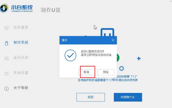 3.弹出提示备份u盘数据,点击确定,等待系统下载完成。u盘生产成功后,在提示中点击取消。生产完成后,按下快捷键,查看需要重新安装系统的启动热键,拔出u盘。