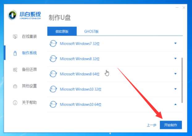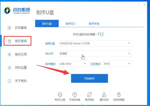 1.将空u盘插进电脑上,打开小白一键重新装入系统软件,关闭杀毒工具(包括360安全卫士),等小白检测环境完成后,点一下制作系统,开始制作。