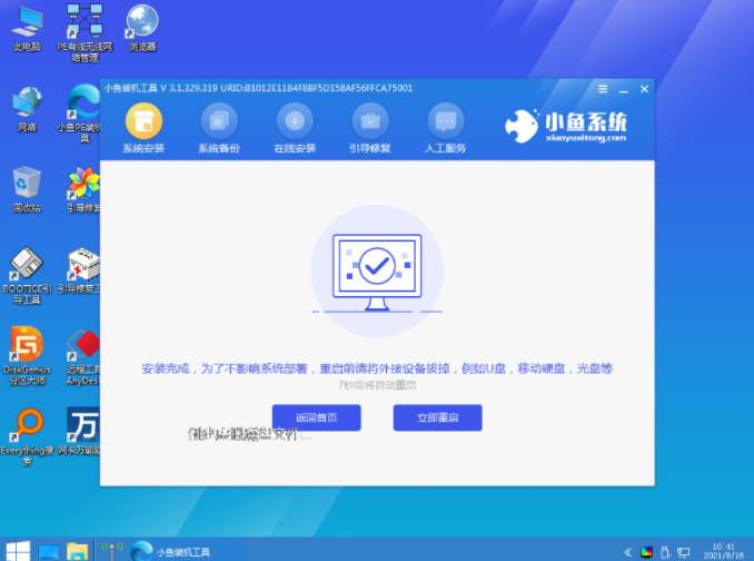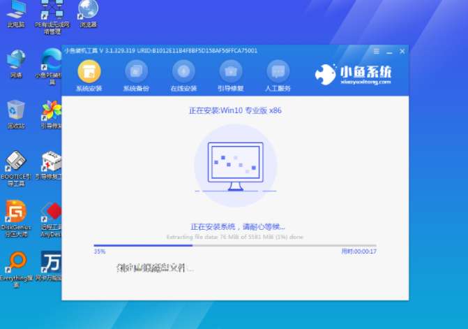 4、我们在开机不断按启动热键进启动界面当中,选择u盘启动项回车确定进入到pe选择界面后,选择第一项pe系统回车进入。在pe系统上打开小鱼装机工具,选择win10系统点击安装。