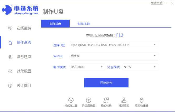 1、首先我们在电脑中下载安装好小鱼一键重装系统软件并打开,接着插入一个8g以上的空白u盘,在打开的页面中选择u盘重装系统模式,点击开始制作按钮。