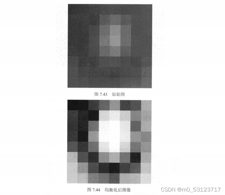 在原始图像对比度本来就很高的情况下,如果再均衡化则灰度调和,对比度会降低。在泛白缓和的图像中,均衡化会合并一些象素灰度,从而增大对比度。均衡化后的图片如果再对其均衡化,则图像不会有任何变化。如图7.45、7.46所示。