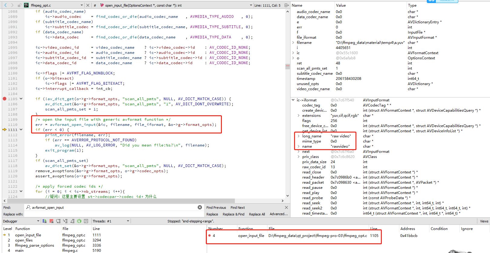 如上图所示,在 avformat_ open_ input () 方法前设置断点, 然后按 Enter 键 。运行后可以发现 ic->iformat->long_name 等于 "raw video",FFmpeg 4. 搜索两个源代码中关键词“原始视频”的搜索可以发现,iblibavformatraw vicdec.c 是YUV的解决方案 内部实现。请看下面代码