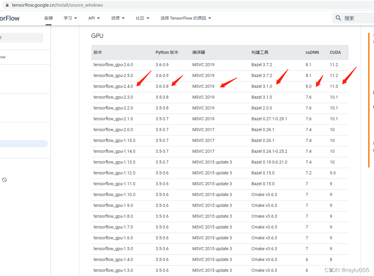 根据CUDA版本的视频卡支持。选择相关 shorflow 支持的顶部版本, 然后单击下面的 URL 查看相关 shorplow 支持的对应版本版本, 然后单击下面的地址查看相应的版本 。不同版本的配对和匹配至关重要。不然后面很折腾。Tensorflow 不支持 CUDA11. Verion 1, 因为它不可用 。为了兼容性,我使用了CUDA11.0,这相当于一个柱形配置。