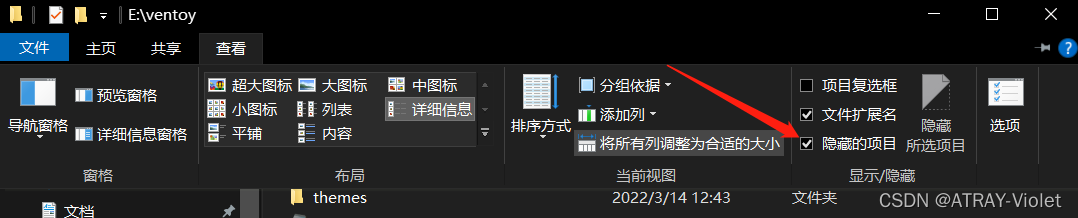 2) 打开通风文件夹。 由于“ ventoy”, 请打开文件管理器的“ 隐藏项目设置 ” 。 json 文件被隐藏 。