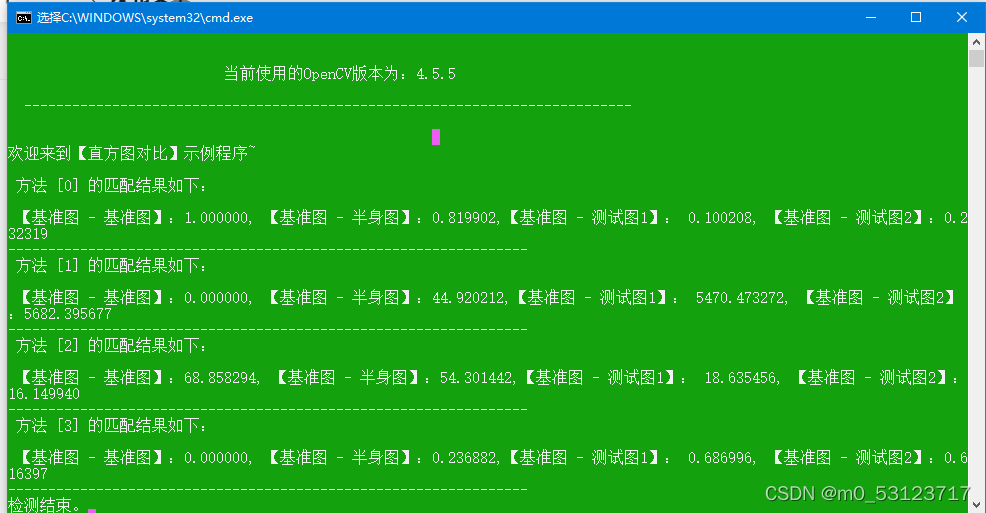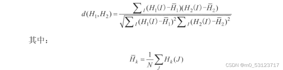 前两个变量的直方图大小比较相同,第三个变量是选择的距离标准。以下四种方法可用于比较两个直方图(第一个是HI,第二个是H2):