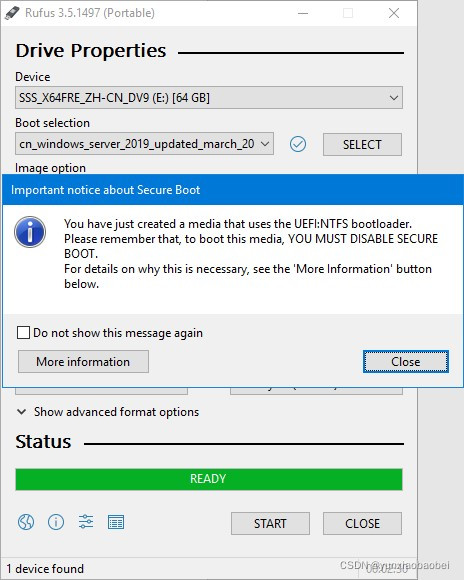 Rufus-3.5 p.m.m.zip 这种技术可用于为大于4GB的ISO文件(如Windows Server 2016/2019)制作可启动的光盘。当Rufus首次启动时, 将检查提醒是否更新 。要返回主界面,请单击 " no " 。