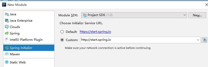 此时要上网至关重要, 因为模板必须从网络上读取, 而 Spring Initalizr 是 Springboot 项目的模板 。