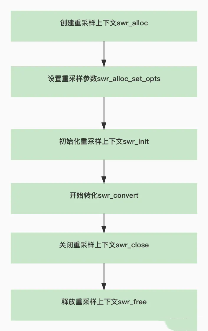 “ 重新抽样” 是指将音频输入参数纳入一定值输出的过程, 其好处是单个玩家的音效输出是结果。 那么, 您如何使用 FFmpeg API 进行重新抽样? 首先, 考虑以下流程图 :