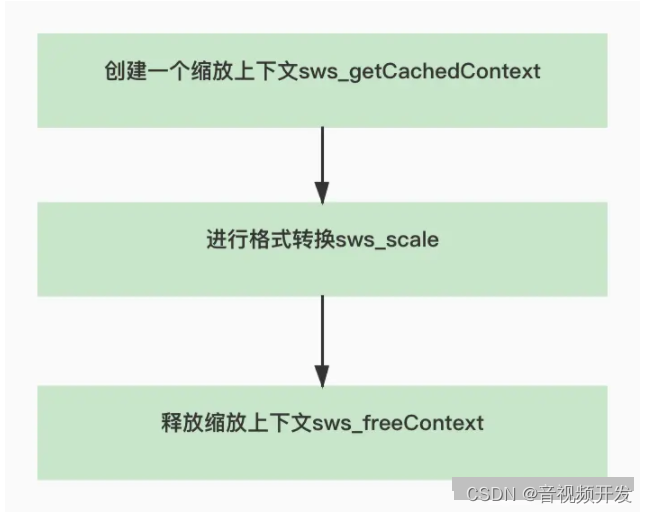 视频像素格式基本上是YUV转换成RGB。同样的API也由FFmpeg提供。它利用CPU操作转换。效率是比较低的。旋转时,我们使用 OpenGL GPU。效率比较高。虽然FFmpeg API转换效率不高,但不能改变。然而,我们可以继续学习。使用流程如下: