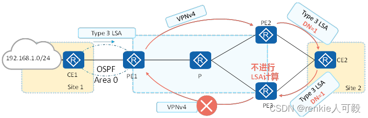 PE的OSPF多位状况算法忽略了DD定位的LSA,而计算时却忽略了LSA,使PE无法通过CE了解LSA引起的循环。