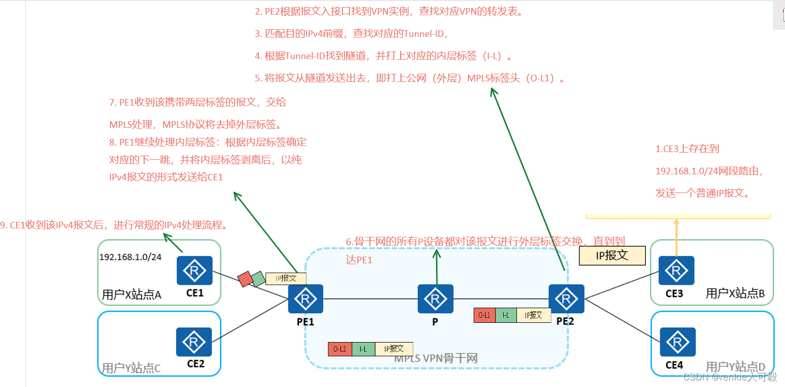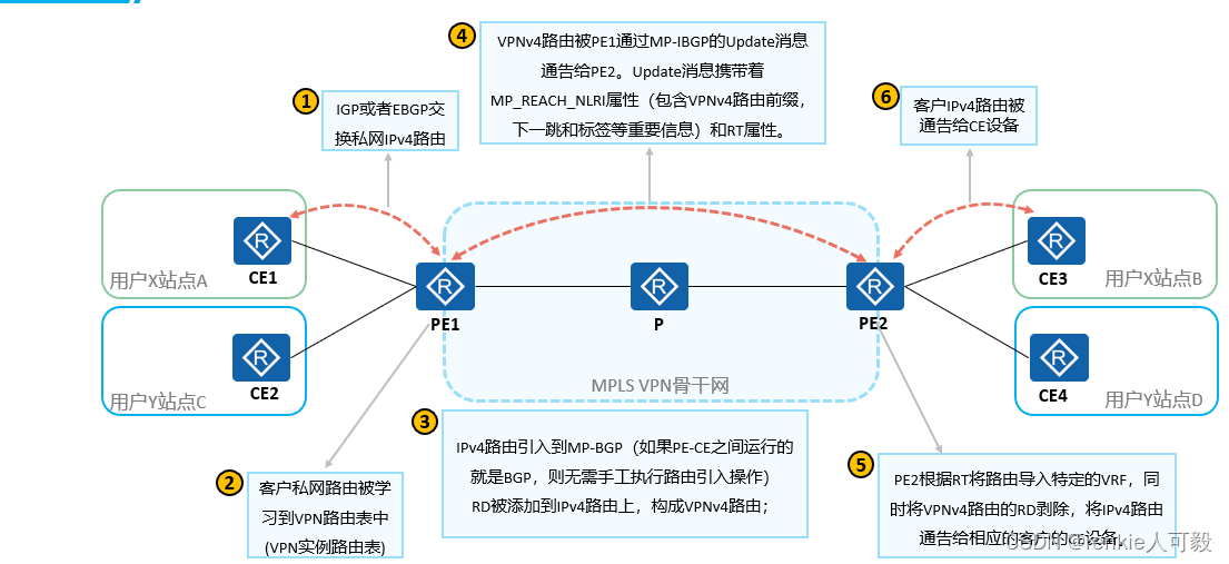PE接收由CE发放的路线以及RD值,并将其转换为网络的单一全球VPN-IPV4线路。