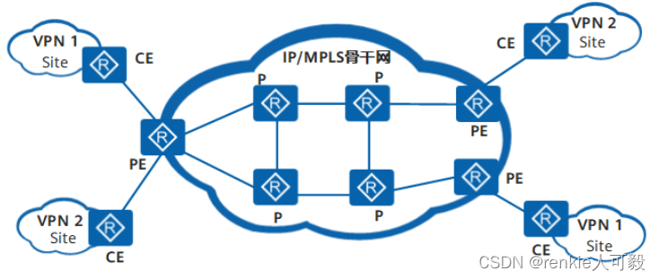 CE: 与 PE 接口的用户边缘设备,不检测 VPN 路径的存在,不需要 MPLS 支持 。