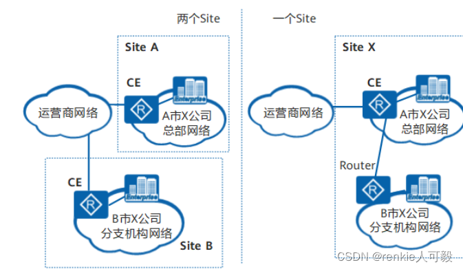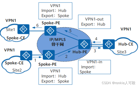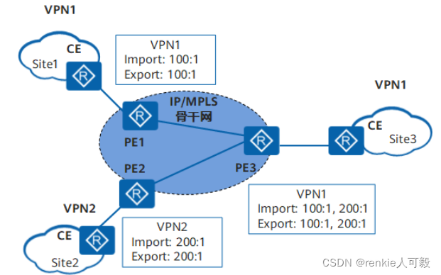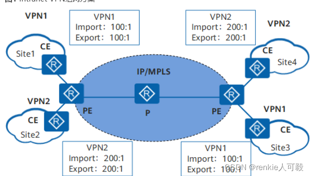 每个站点都与PE上的VPN实例相联系。 VPN实例综合了VPN成员关系及其与站点连接的路线规则。 根据VPN实例的规则,几个站点被合并成VPN。