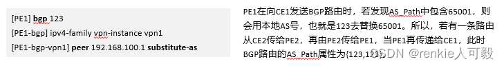 将采用同侪代用指令,以当地AS取代接收的私人网络线路,即CE所在地的VPN站点的AS号,以便最终的CE不会因为AS重复而放弃。