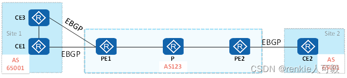 如果CE1通过EBGP和PE2向PE1传输一条私人互联网线路,通过EBGP和PE2向CE2传送一条私人互联网线路,AS将因该线路一再废弃而放弃CE2,从而无法将第1站点和第2站点并入同一VPN。