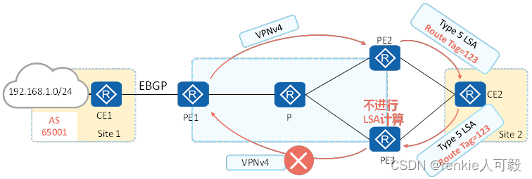 VPN 根标记( VPN 路标标签) 可用于避免这5或7个路环。根据收到的BGP私人网络线路,PE产生5/7型LSA,然后用于产生一种新的LSA。运输VPN路标。当PE发现LSA的VPN路线标志与当地定义的标志相同时,我不知道我该怎么办, 但我也不知道我该怎么办, 我也不知道我该怎么办, 我也不知道我该怎么办。因此,上述电路可以避免。
