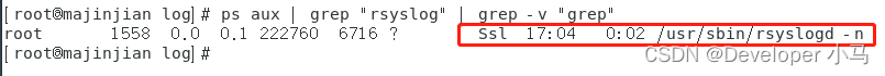 CentOS6.x版本的日志服务是syslogd;CentOS7.x版本的日志服务是rsyslogd,二者是兼容的。这里使用的rsyslogd,它的功能更加强大。rsyslogd实际上是一个后端程序/服务。管理操作系统中的日志。询问Linux中的rsyslogd服务是否使用命令启动ps aux | grep "rsyslog" | grep -v "grep";