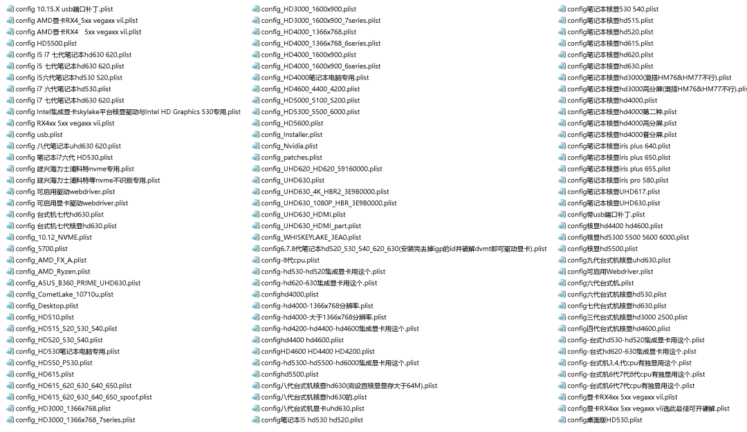 一些常见的驱动器也放在Kexts驱动文件夹中,有多种驱动程序,如语音卡、网络卡、麦克风、蓝牙等,适用于大多数市场上通用的机器!对于小白是福音,你不需要配置自己的配置,根据您的配置,选择合适的配置,删除默认配置.但没有万能的电子指南,如果无法安装自驱动指南,请在您的电脑上搜索适当的efi指南.
